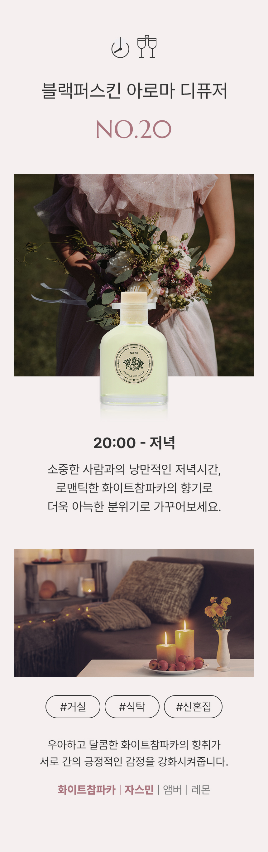 섬세한 정원의 아름다움 " 로맨틱 하모니 넘버 20은 화이트참파카와 자스민의 우아한 향기로 긍정적인 감정과 포근한 우디향의로 로맨틱한 분위기를 연출합니다.